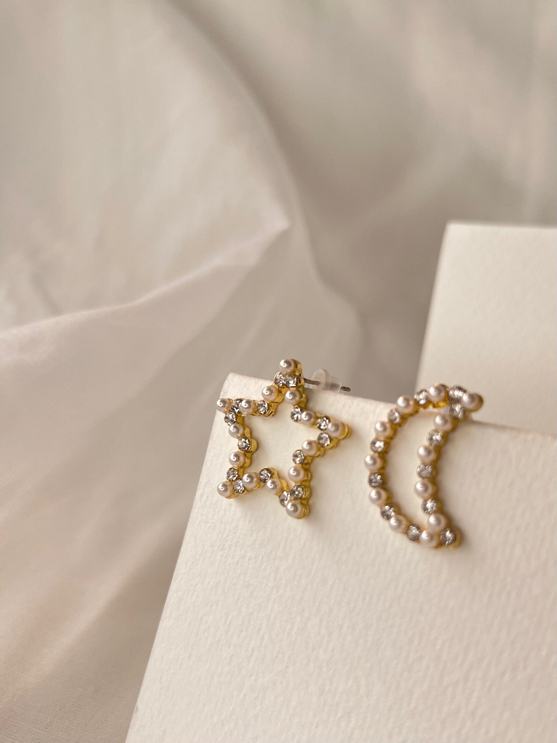 Embrace the allure of the night sky with our Celestial Harmony Pearl Studs, a delicate pair of earrings that capture the mystical beauty of the cosmos. One earring is gracefully shaped like a crescent moon, while its companion takes the form of a radiant star. Each piece is meticulously adorned with tiny, lustrous pearls, adding a soft glow that enhances their celestial charm. These asymmetrical earrings are a perfect blend of elegance and whimsy, making them a unique accessory for those who appreciate subtle yet sophisticated designs. Ideal for both everyday wear and special occasions, the Celestial Harmony Pearl Studs are a poetic expression of your style and grace.