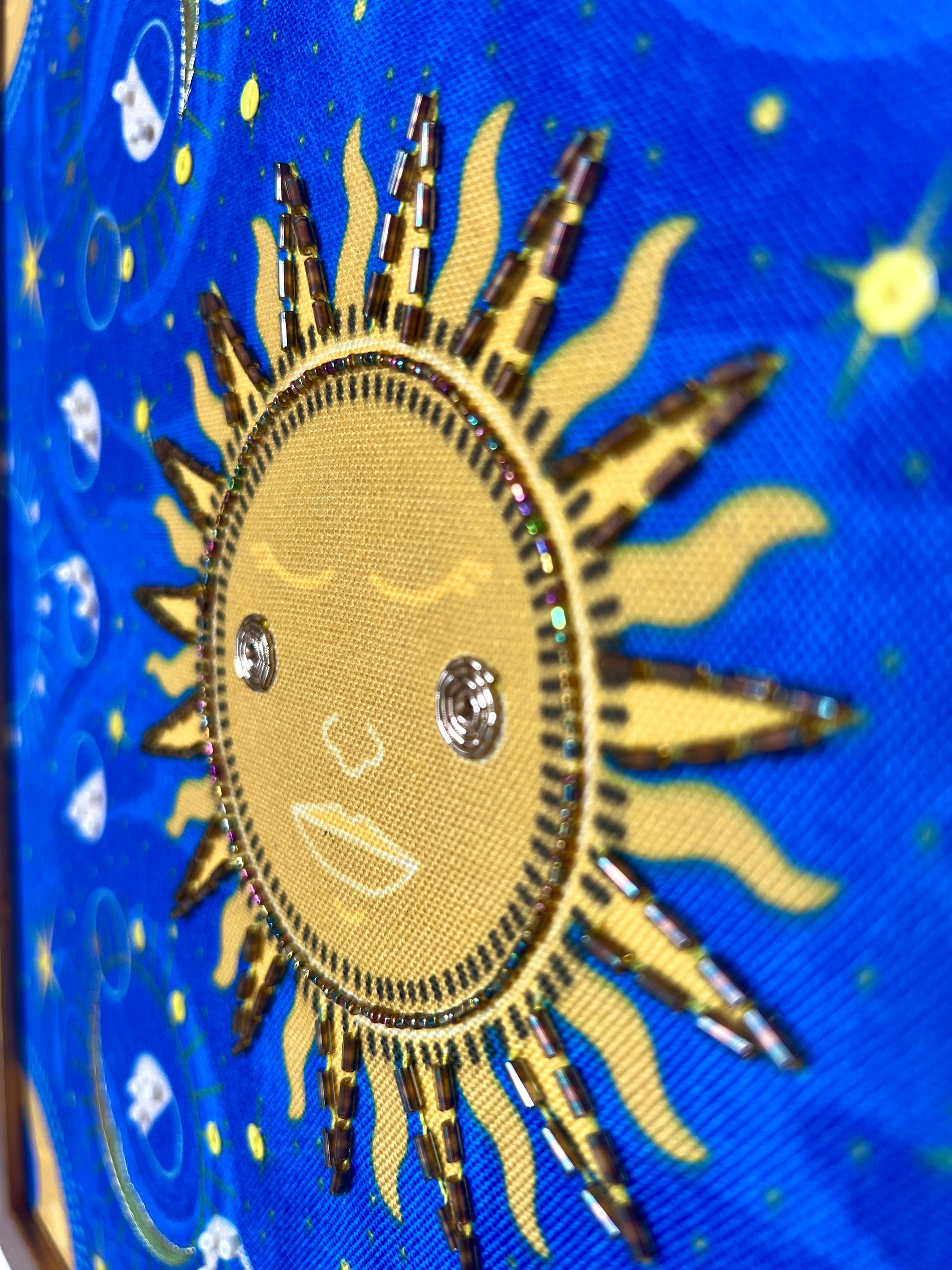 Illuminate your space with "Celestial Harmony," a breathtaking wall art piece that masterfully captures the celestial ballet of the sun, moon, and stars against a regal royal blue backdrop. The artwork's abstract background creates a mesmerizing contrast, allowing the cosmic elements to shine with vibrant energy. Each celestial body is rendered with exquisite detail, reflecting the timeless dance of day and night, and the boundless beauty of the universe. "Celestial Harmony" offers a refined and elegant touch to any interior, inviting you to revel in the sublime interplay of cosmic grandeur and artistic expression. Perfect for adding a touch of celestial magic to your home. The original illustration is digitally printed onto canvas and embellished with delicate hand embroidery.