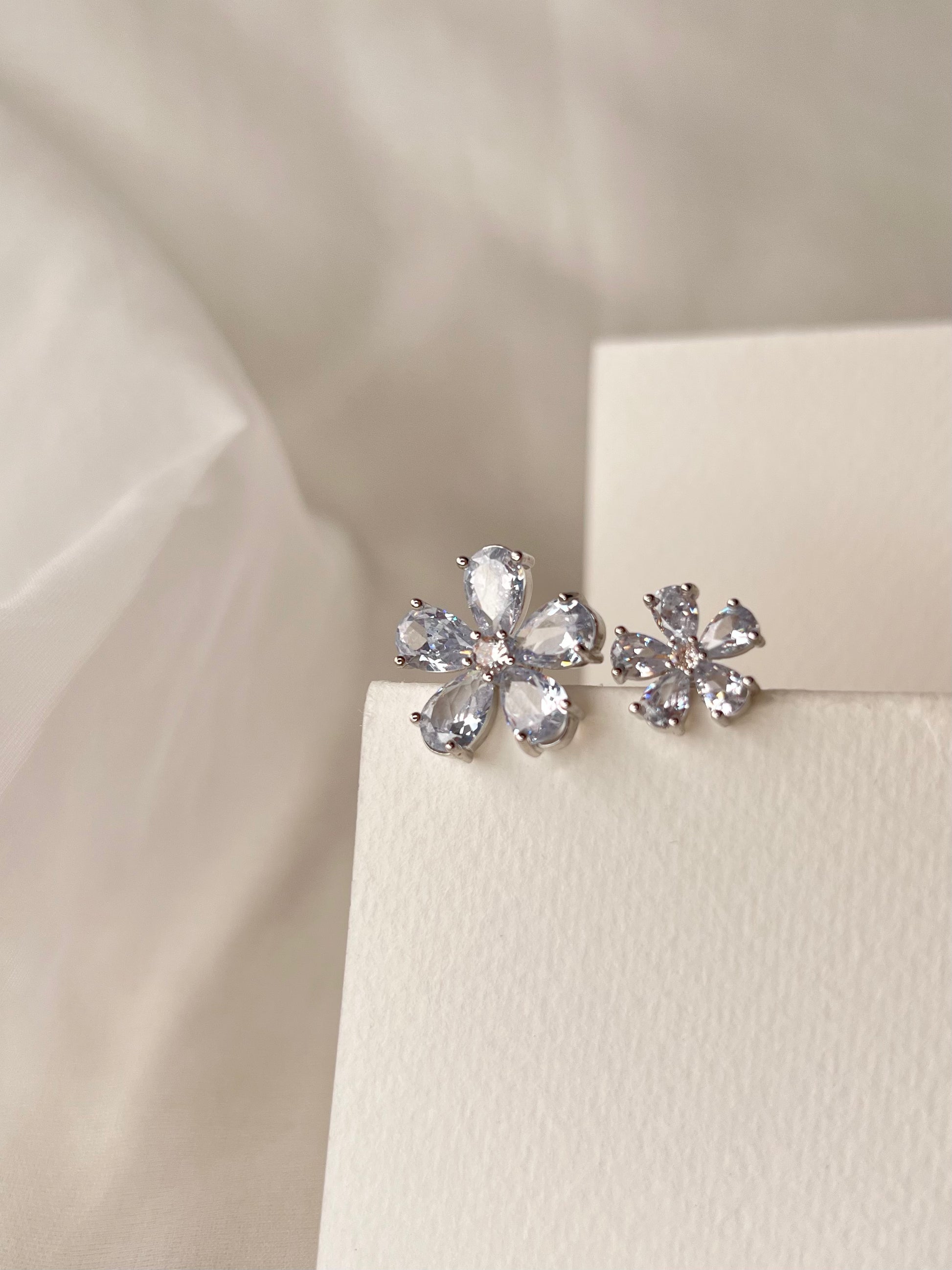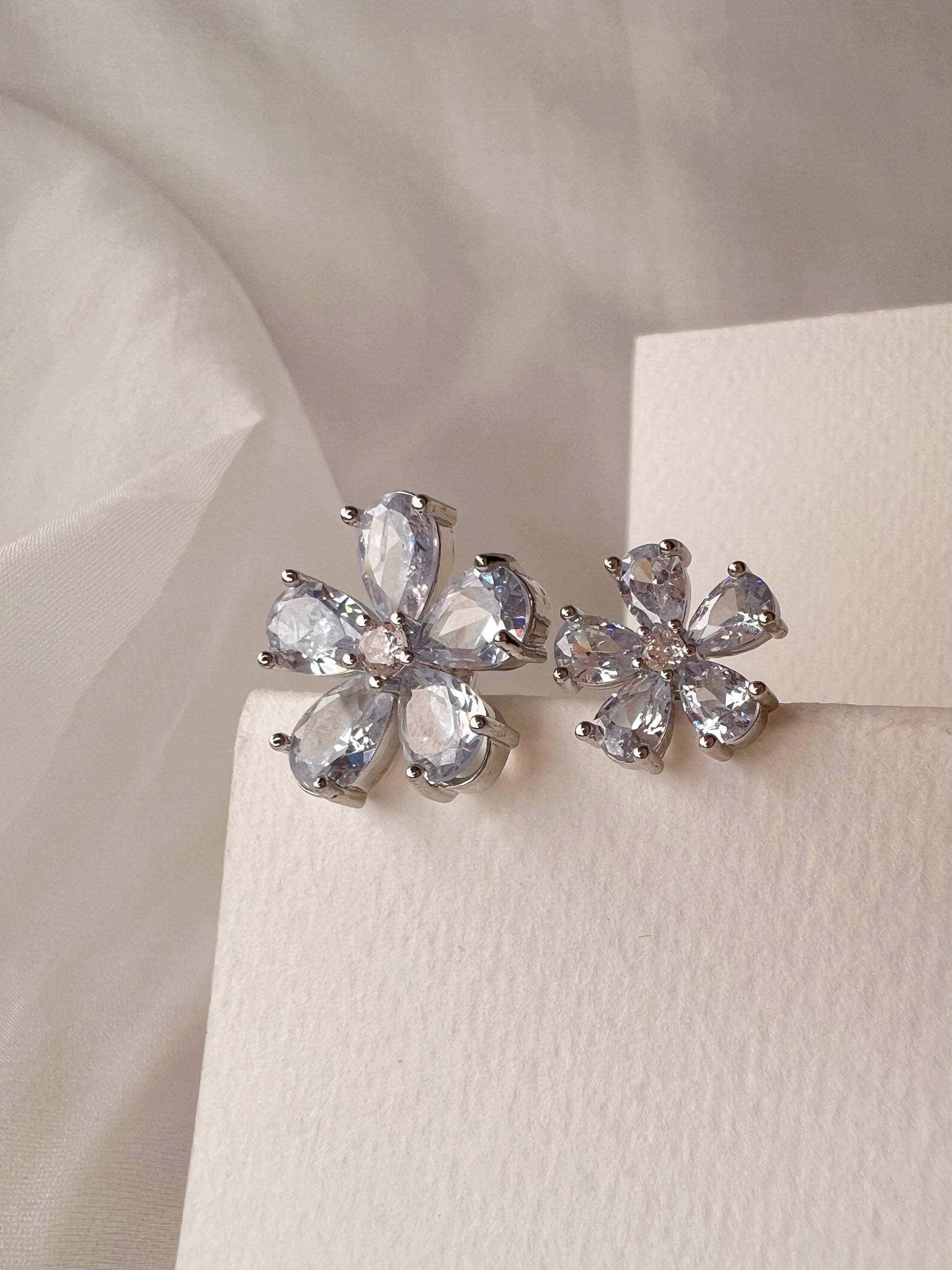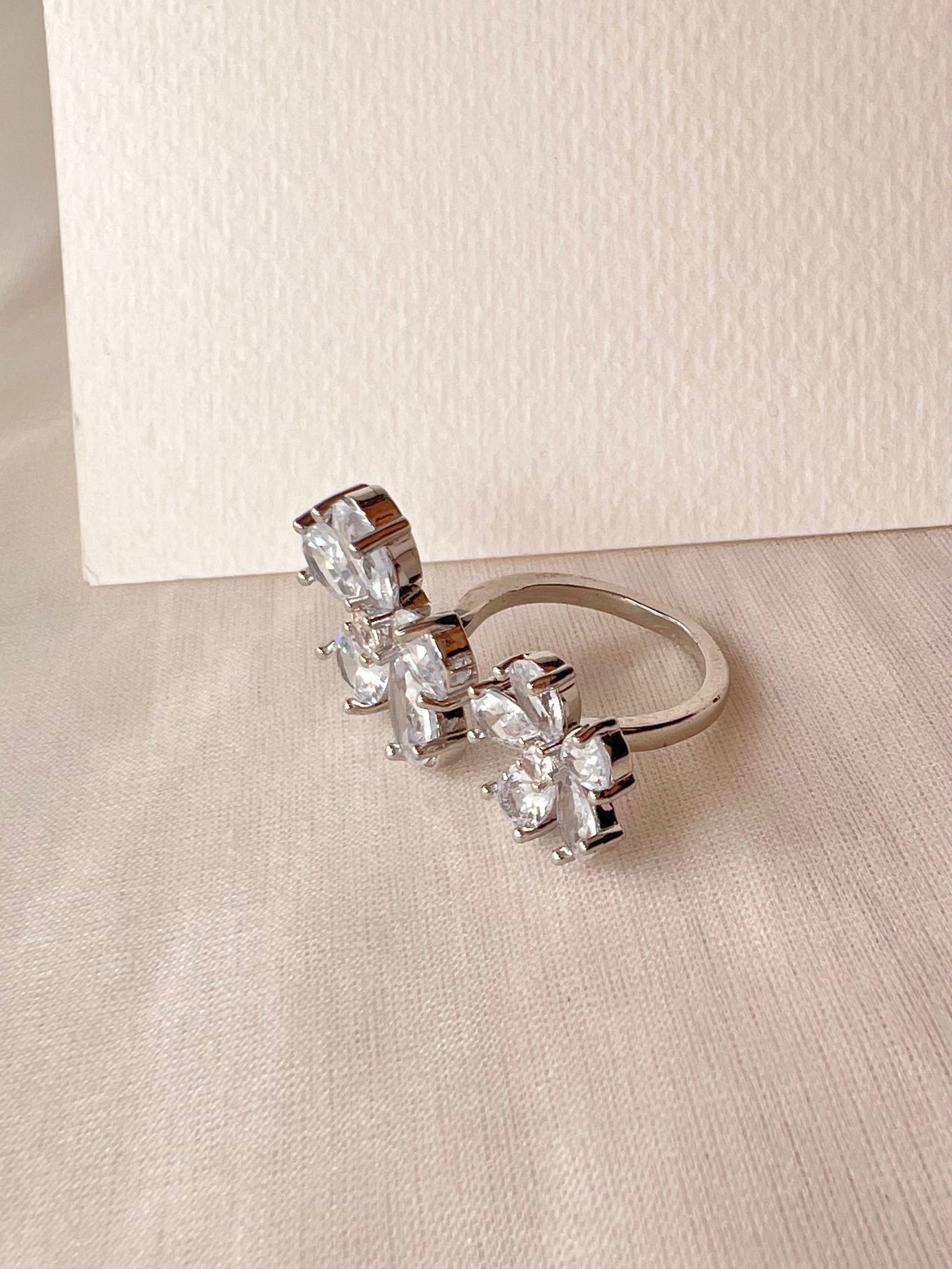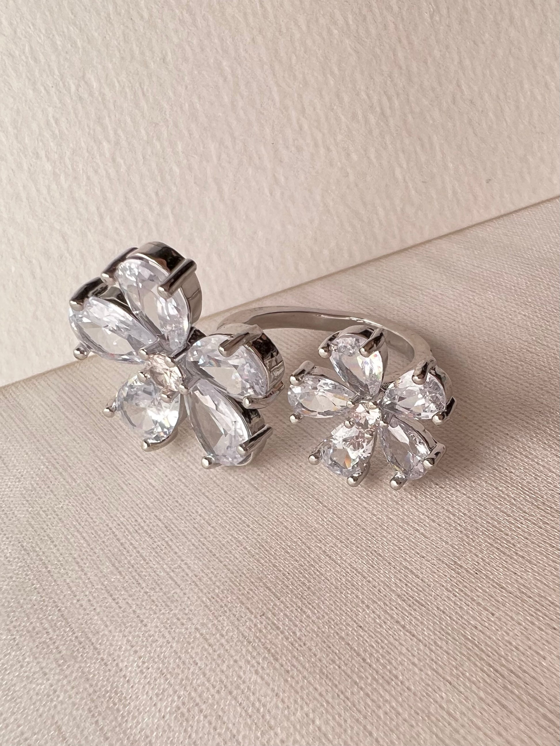 Elevate your style with the understated elegance of our Crystal Blossom Open Ring. This exquisite piece features an open band design, crafted in a lustrous silver color for a modern and versatile look. Adorning each end of the band are two beautifully faceted clear crystal flowers, their brilliance capturing and reflecting light with every movement. The delicate floral embellishments add a touch of sophistication and grace, making this ring a perfect choice for both everyday wear and special occasions. The open band design ensures a comfortable fit and allows for a customizable touch, seamlessly blending contemporary design with timeless elegance.