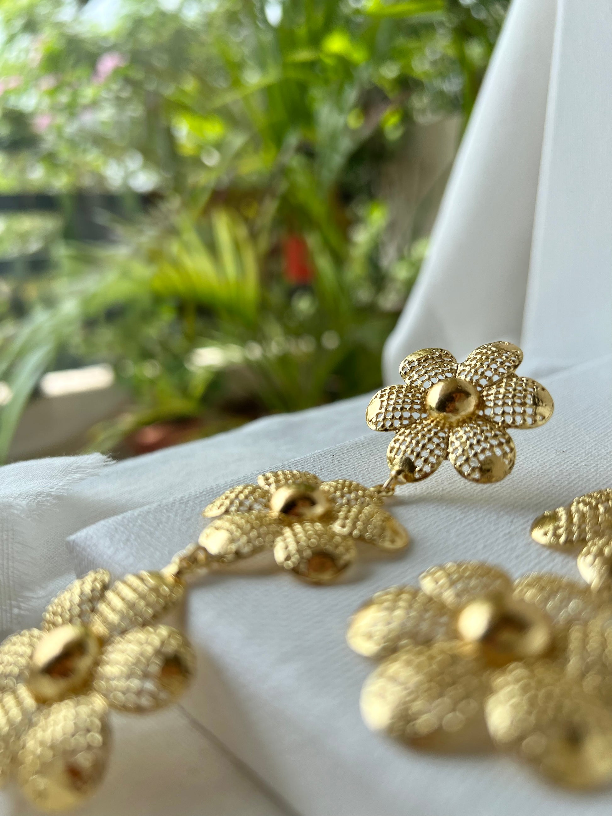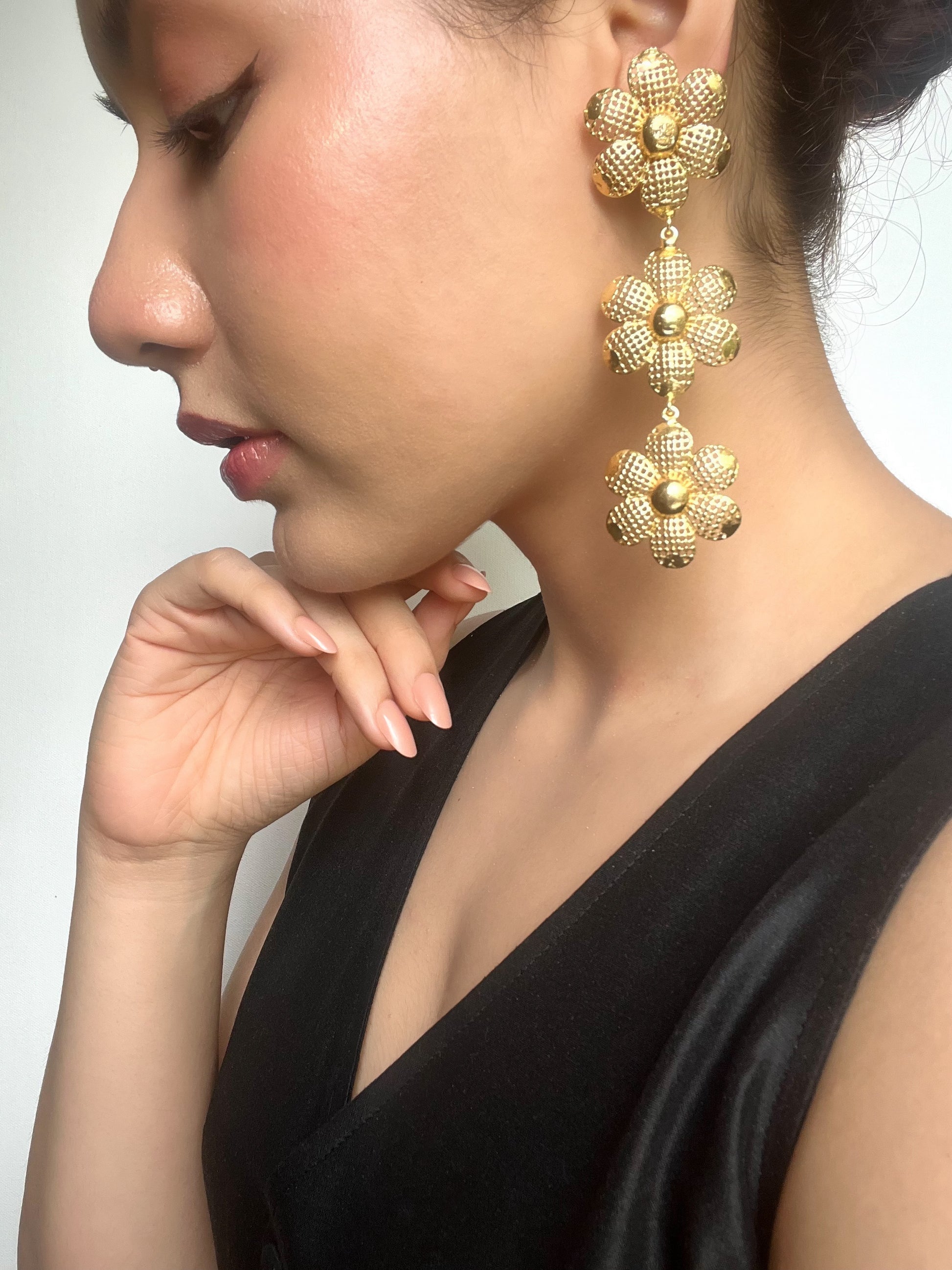 Radiate festive elegance with the Golden Daisy Cascade Earrings, a striking pair of handcrafted statement earrings designed to captivate. Made from fine brass and finished with luxurious 18K gold plating, these earrings feature three bold daisy flower motifs, beautifully suspended one below the other in a graceful cascade. With their vibrant design and artful composition, these earrings are perfect for making a radiant impression at festive occasions. Bold yet refined, the Golden Daisy Cascade Earrings are a celebration of beauty and craftsmanship, adding a touch of floral grandeur to your ensemble.