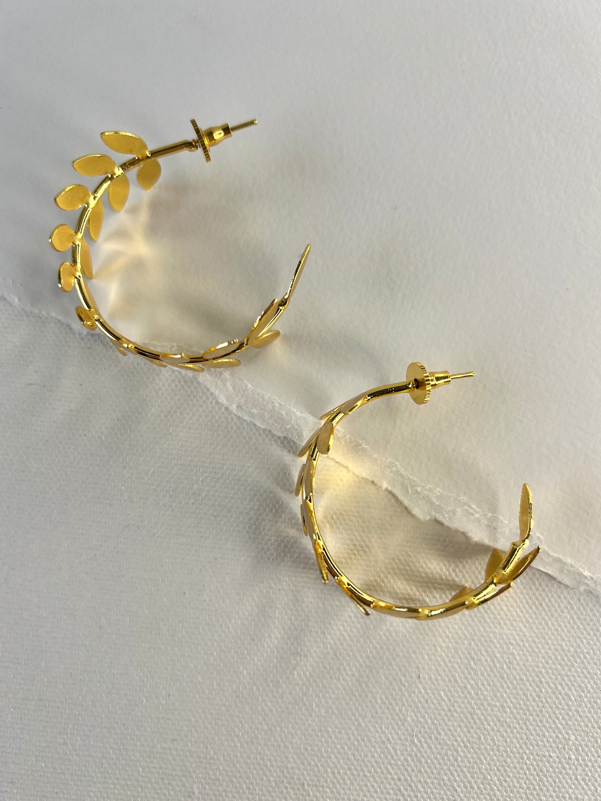 Adorn yourself with the timeless elegance of the "Golden Laurel Hoops," a pair of exquisitely handcrafted earrings that exude natural beauty and refined sophistication. These earrings feature a delicate half-hoop design, gracefully lined with intricately detailed leaves on both sides, symbolizing growth and renewal. Handcrafted in brass and plated with 18k gold, the "Golden Laurel Hoops" offer a luxurious finish that adds a touch of warmth and radiance to any ensemble. Perfect for those who appreciate artisanal craftsmanship and nature-inspired elegance, these earrings are a versatile and stunning addition to your jewelry collection.