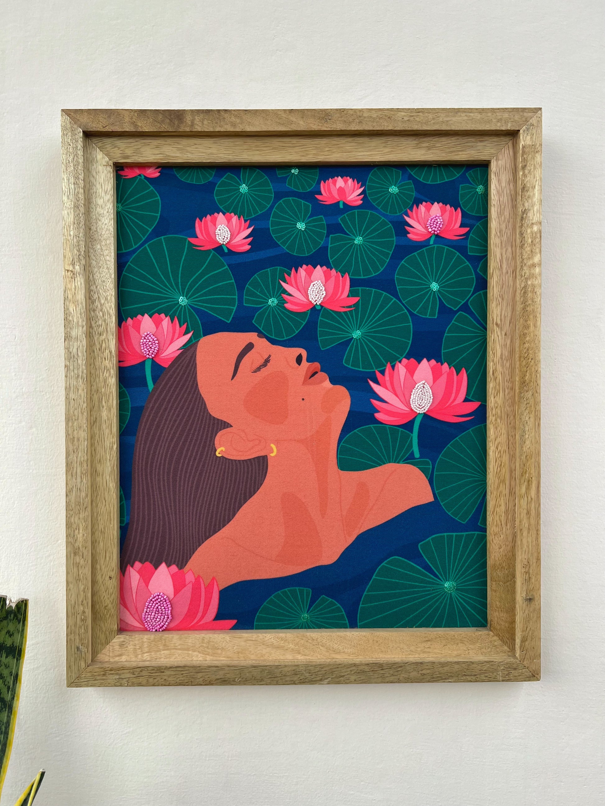 Immerse yourself in the tranquil allure of this stunning wall art, featuring a woman serenely floating in a river brimming with lotus flowers. The deep, rich color palette creates an enchanting atmosphere, enhancing the sense of calm and mystique that radiates from the scene. Each detail, from the delicate petals to the reflective water, is crafted to evoke a sense of peaceful introspection. Ideal for adding a touch of elegance and depth to your space, this artwork is a celebration of beauty, serenity, and feminine grace. The original illustration is digitally printed onto canvas and embellished with delicate hand embroidery. Size- 19x23 inches approximately. Frame- Carved Mango wood frame in a natural wood finish.
