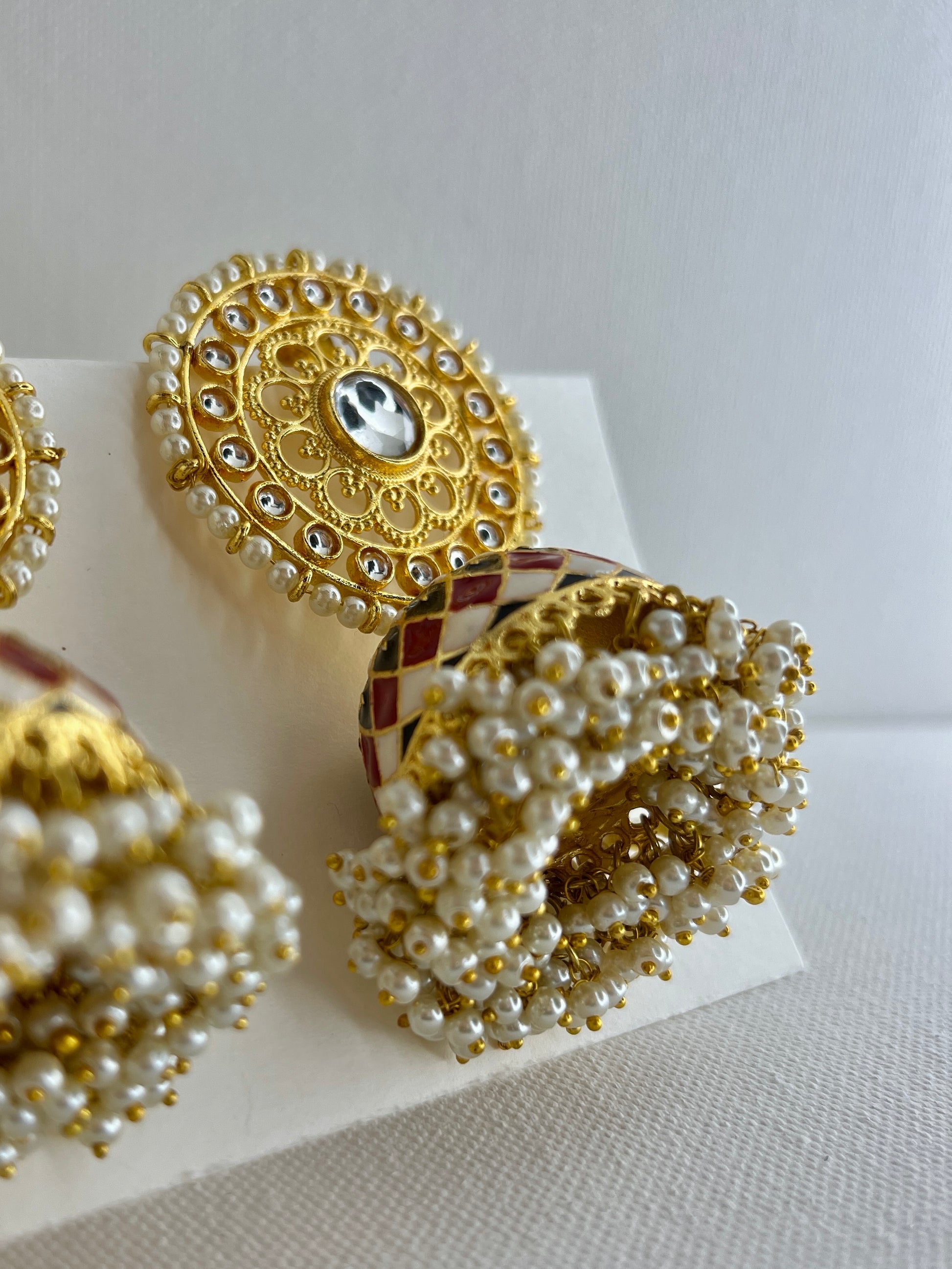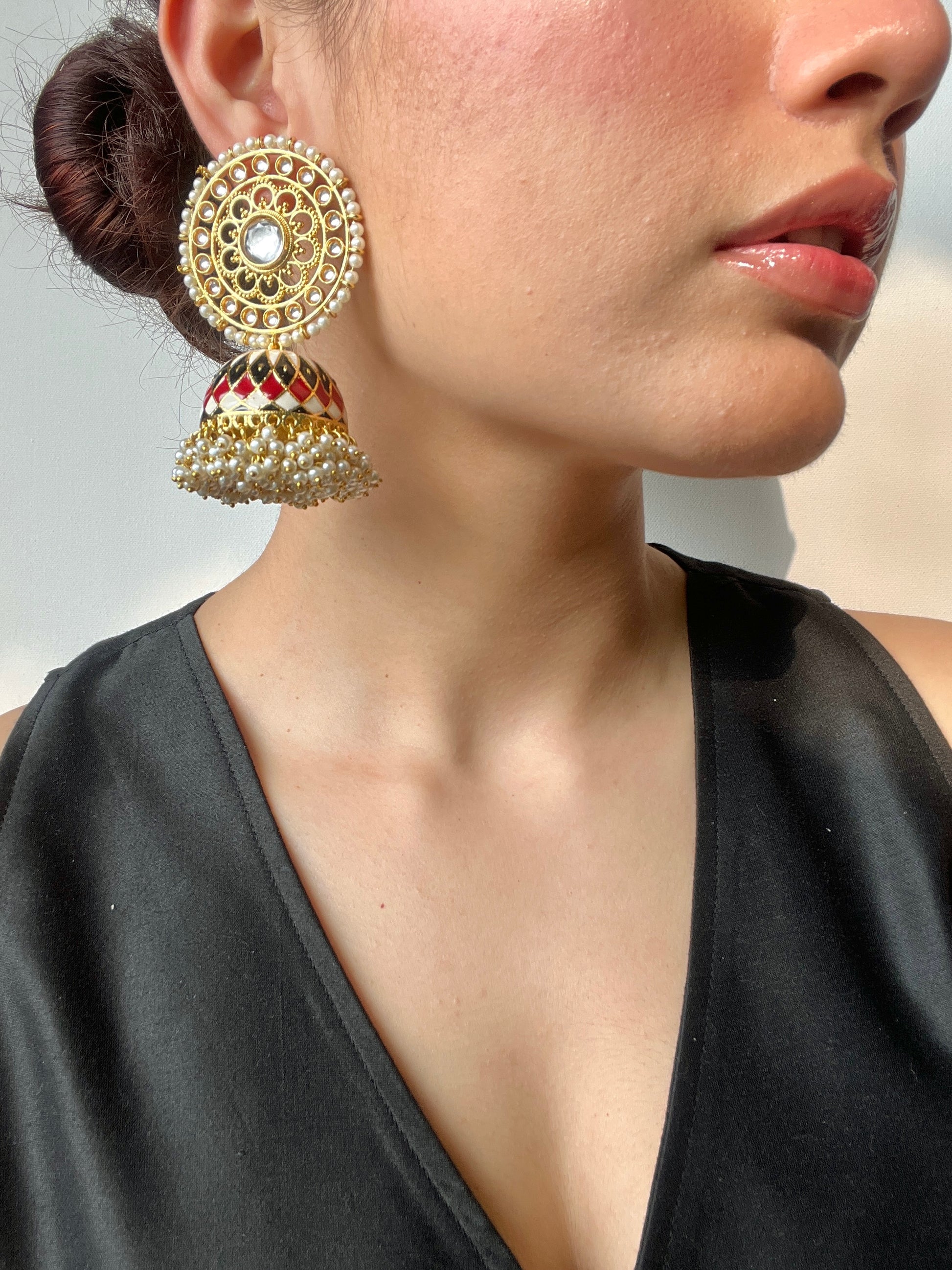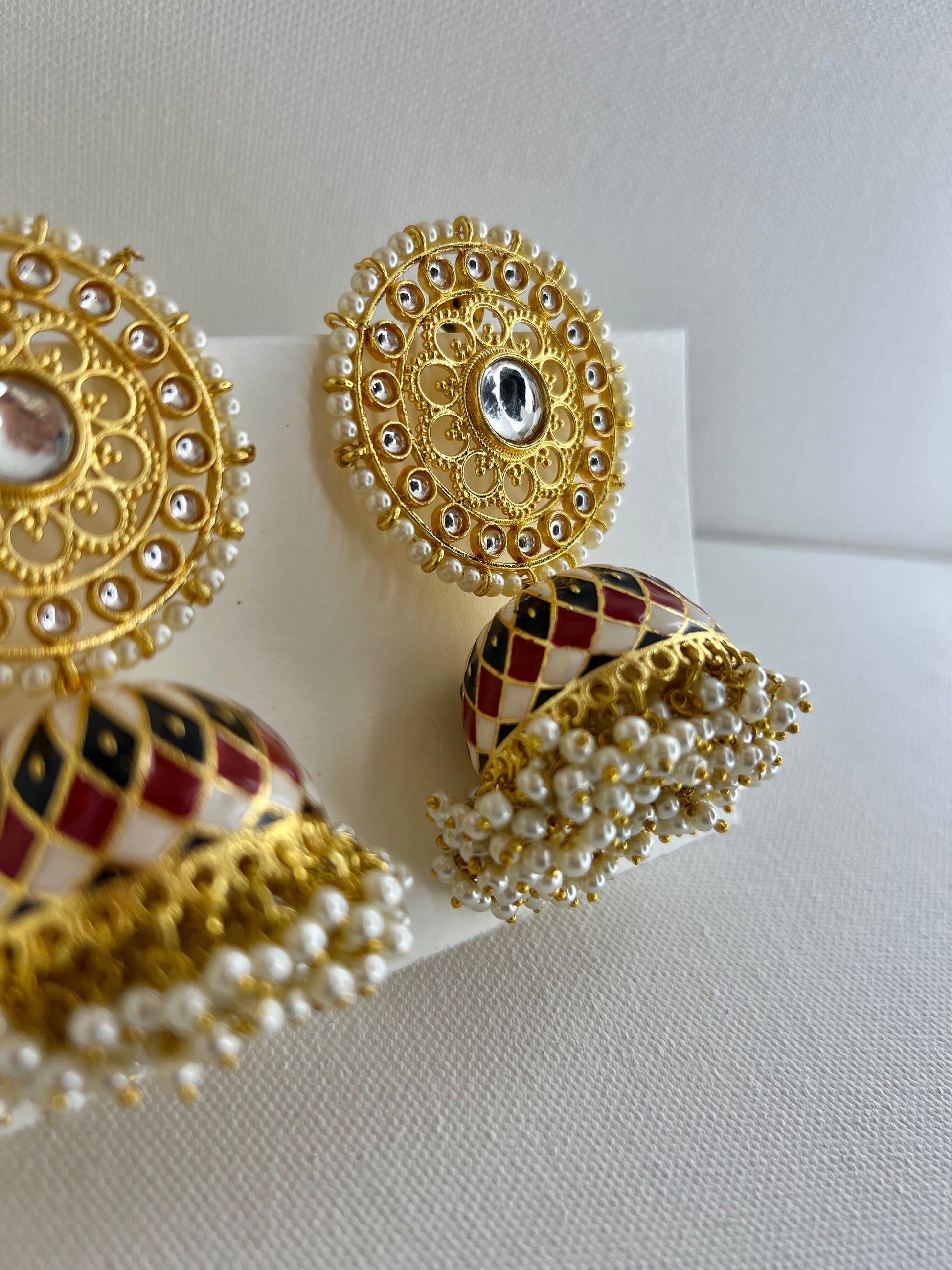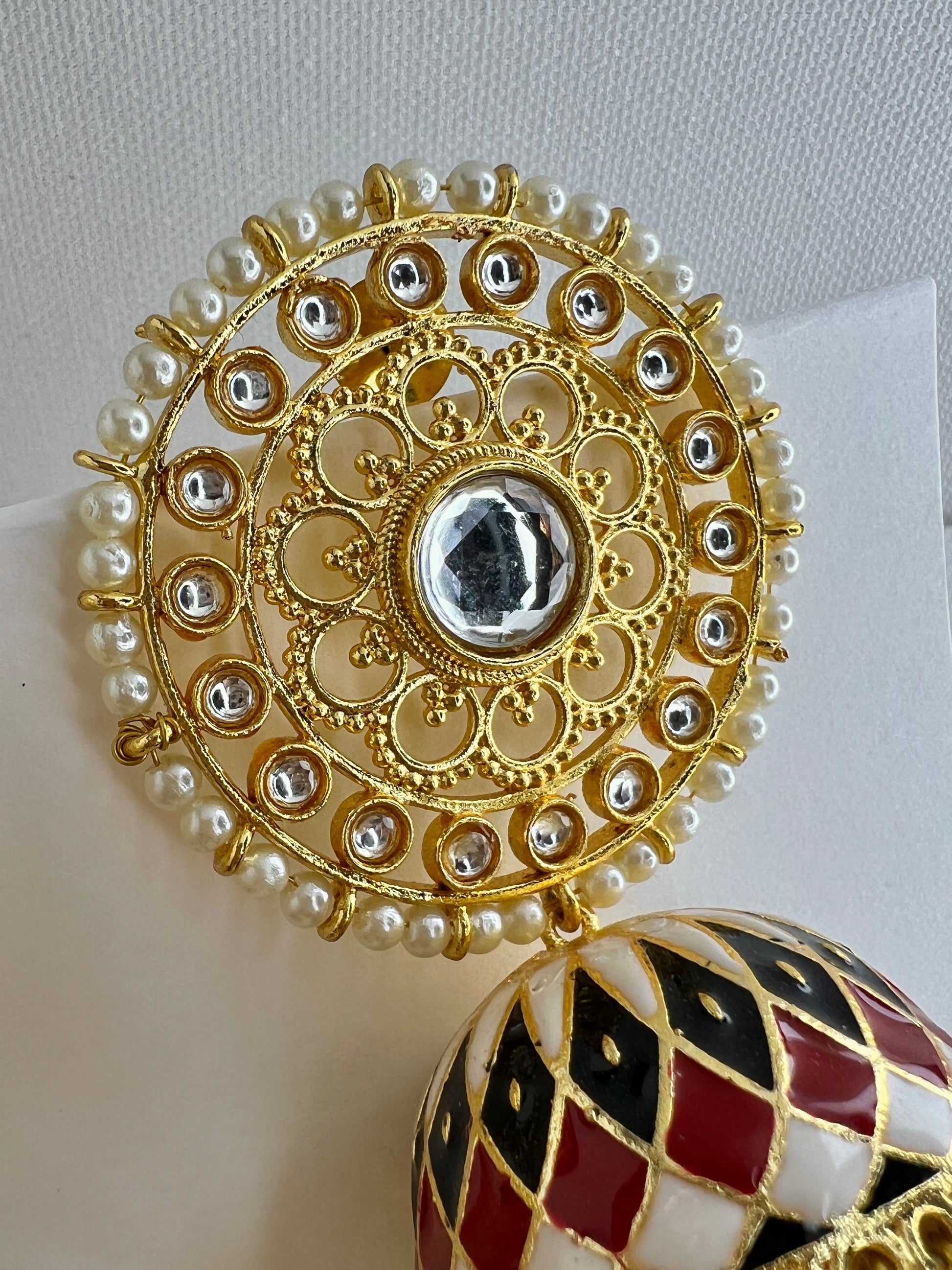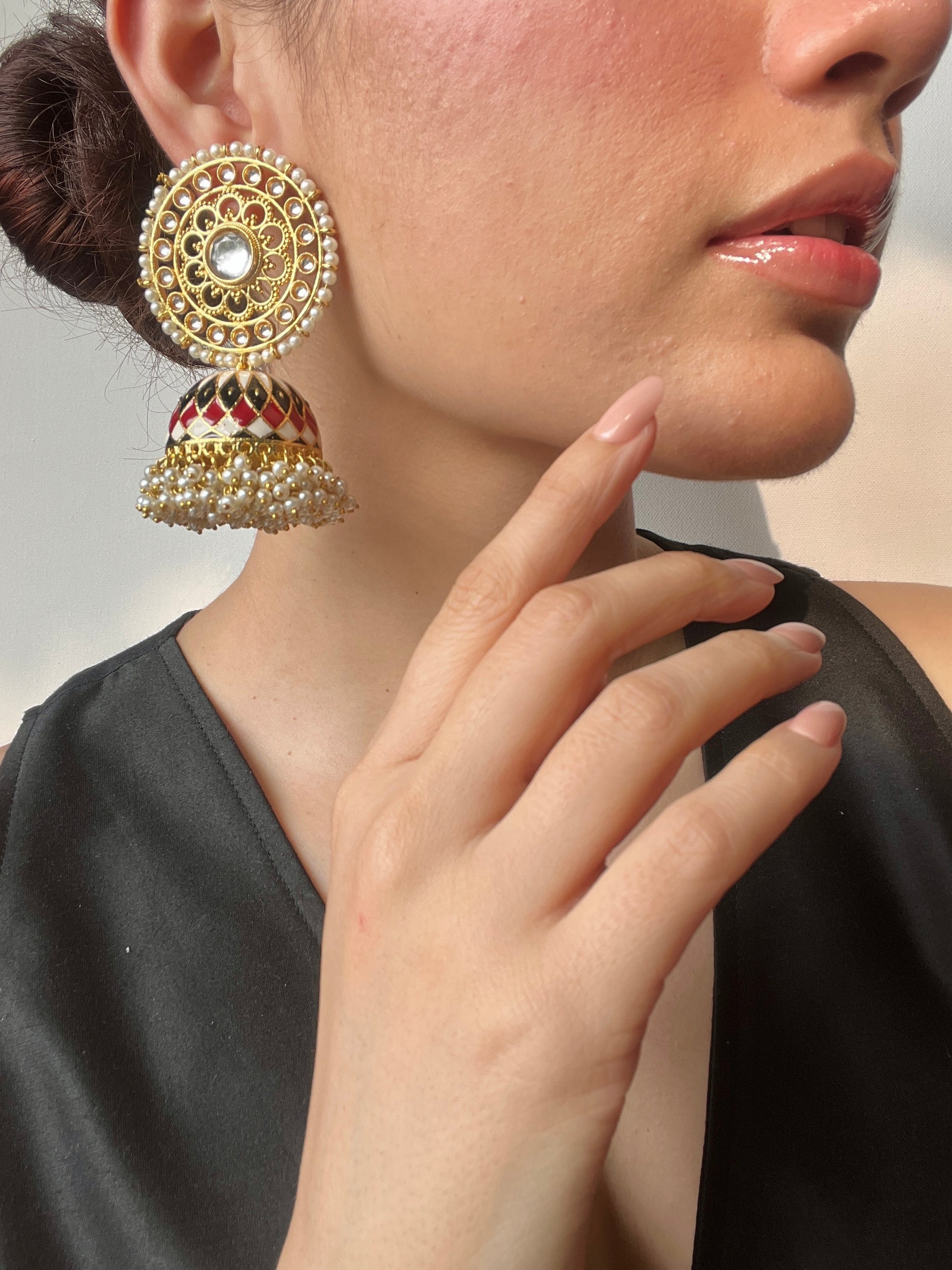 Step into a world where tradition meets contemporary elegance with our Noor Jhumki. These statement earrings feature an intricate mandala design adorning the top half, a symbol of timeless artistry. The bottom half showcases a bold black-red-white checkered pattern, adding a modern twist to the classic jhumki silhouette. Crafted for those who appreciate the fusion of cultures and styles, these earrings are more than just accessories—they are an expression of your unique identity and refined taste. Perfect for any occasion, these jhumkis will elevate your ensemble with a touch of sophisticated charm.