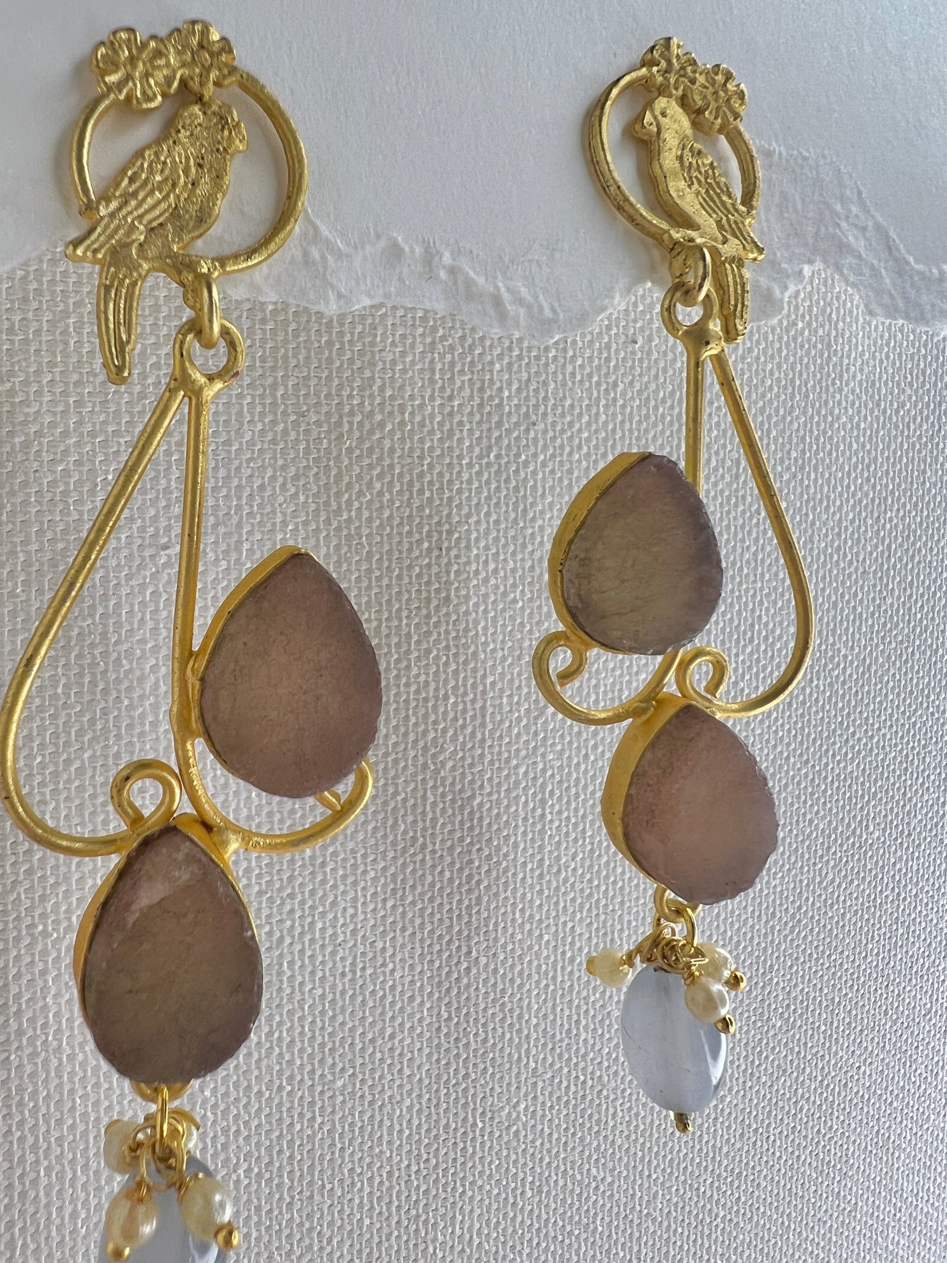 Embrace the elegance of the "Paradis D’Or Earrings," a feminine and sophisticated pair of long earrings that capture the exotic beauty of nature. These stunning earrings feature a delicately crafted parrot motif, adorned with semi-precious stones in soft, neutral hues, exuding a subtle and refined charm. Handcrafted in brass and plated with 18k gold, the "Paradis D’Or Earrings" combine intricate detailing with luxurious materials, creating a graceful accessory that sways with every movement. Perfect for those who appreciate the harmony of nature-inspired designs and timeless elegance, these earrings add a touch of whimsical sophistication to any ensemble, making them an exquisite choice for both special occasions and everyday elegance.