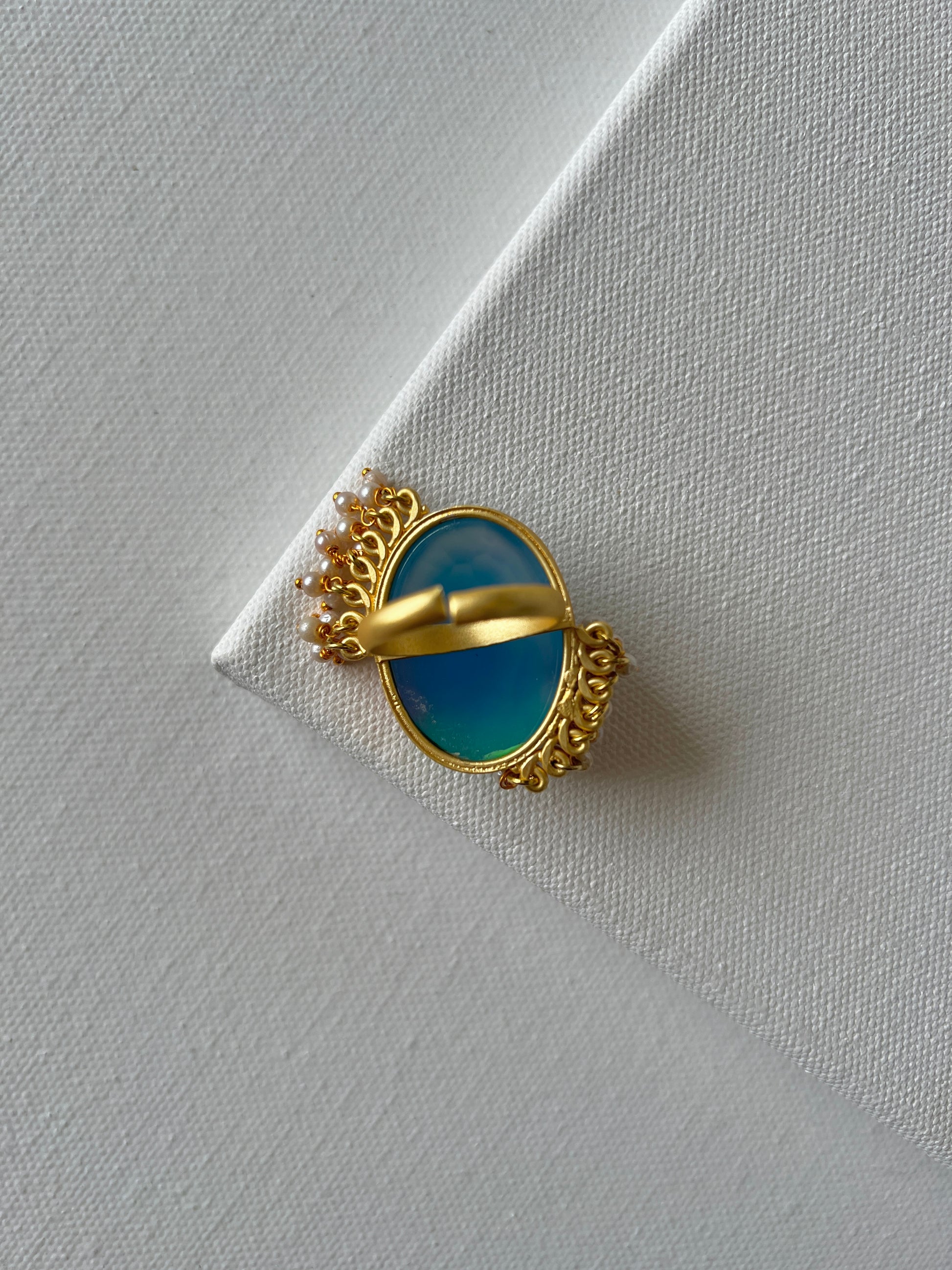 Experience the timeless beauty of devotion with our Radha's Grace Ring. Handcrafted in brass and elegantly plated with 18k gold, this adjustable ring showcases a stunning hand-painted portrait of Radha on a vibrant blue semi-precious stone. The intricate artistry captures Radha's grace and serenity, adding a touch of spiritual elegance to the piece. Delicate pearl hangings dangle gracefully, enhancing the ring's sophisticated charm. Designed for both comfort and style, the Radha's Grace Ring adjusts effortlessly to fit any finger, making it a unique and meaningful addition to your jewelry collection. Celebrate the intersection of artistry and spirituality with this exquisite statement piece.