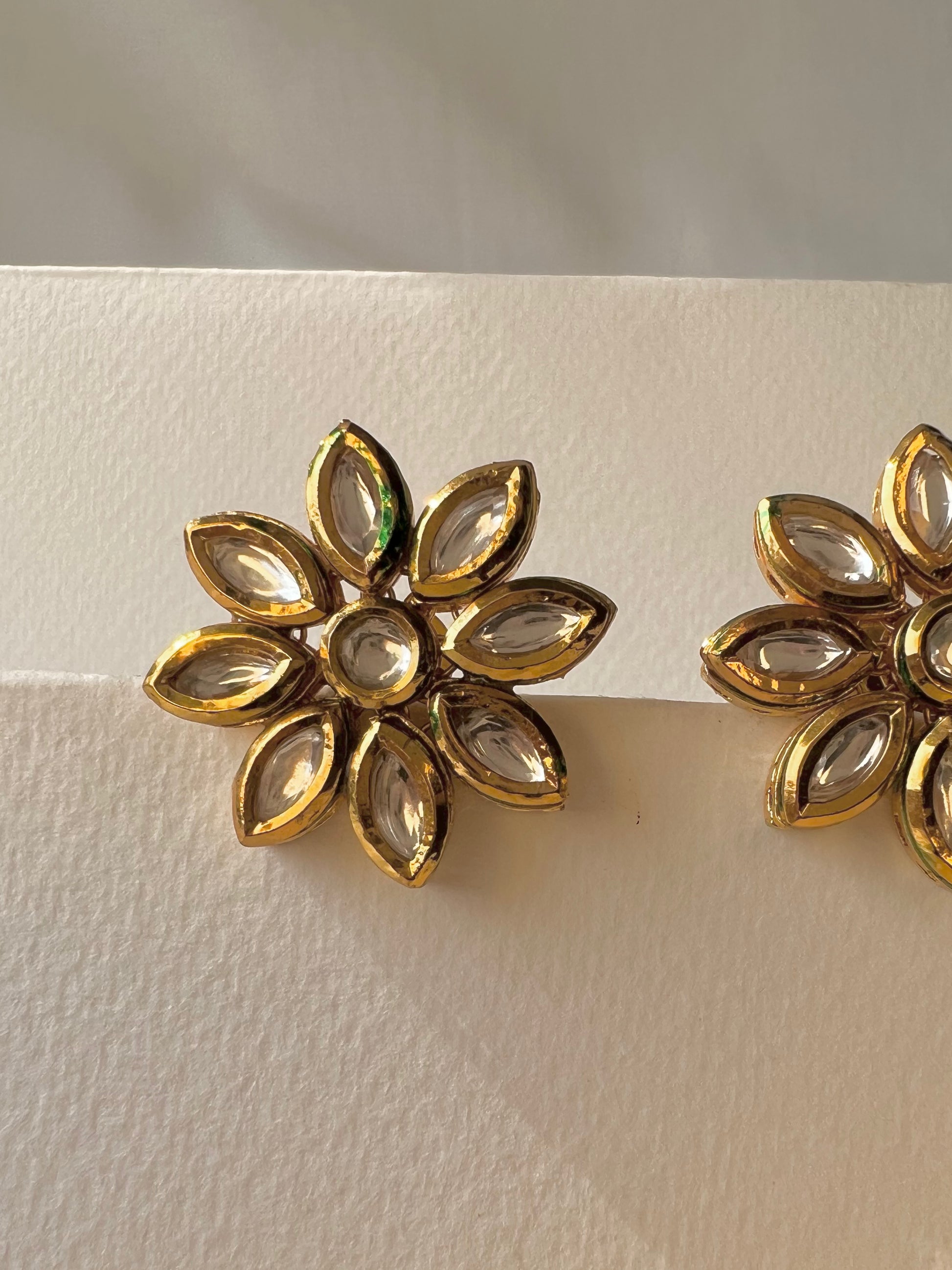 Experience the exquisite charm of traditional Indian craftsmanship with our Star Anise Clear Earrings. These delicate earrings feature an intricate flower motif, meticulously designed to capture the essence of nature’s beauty. Made from high-quality brass and finished in a luxurious golden hue, each petal is encrusted with sparkling clear stones, adding a touch of brilliance to the timeless floral design. Perfectly sized for everyday elegance, the Star Anise Clear Earrings offer a harmonious blend of heritage and modernity, making them an essential addition to your jewelry collection. Ideal for any occasion, these earrings are a radiant expression of your refined taste.