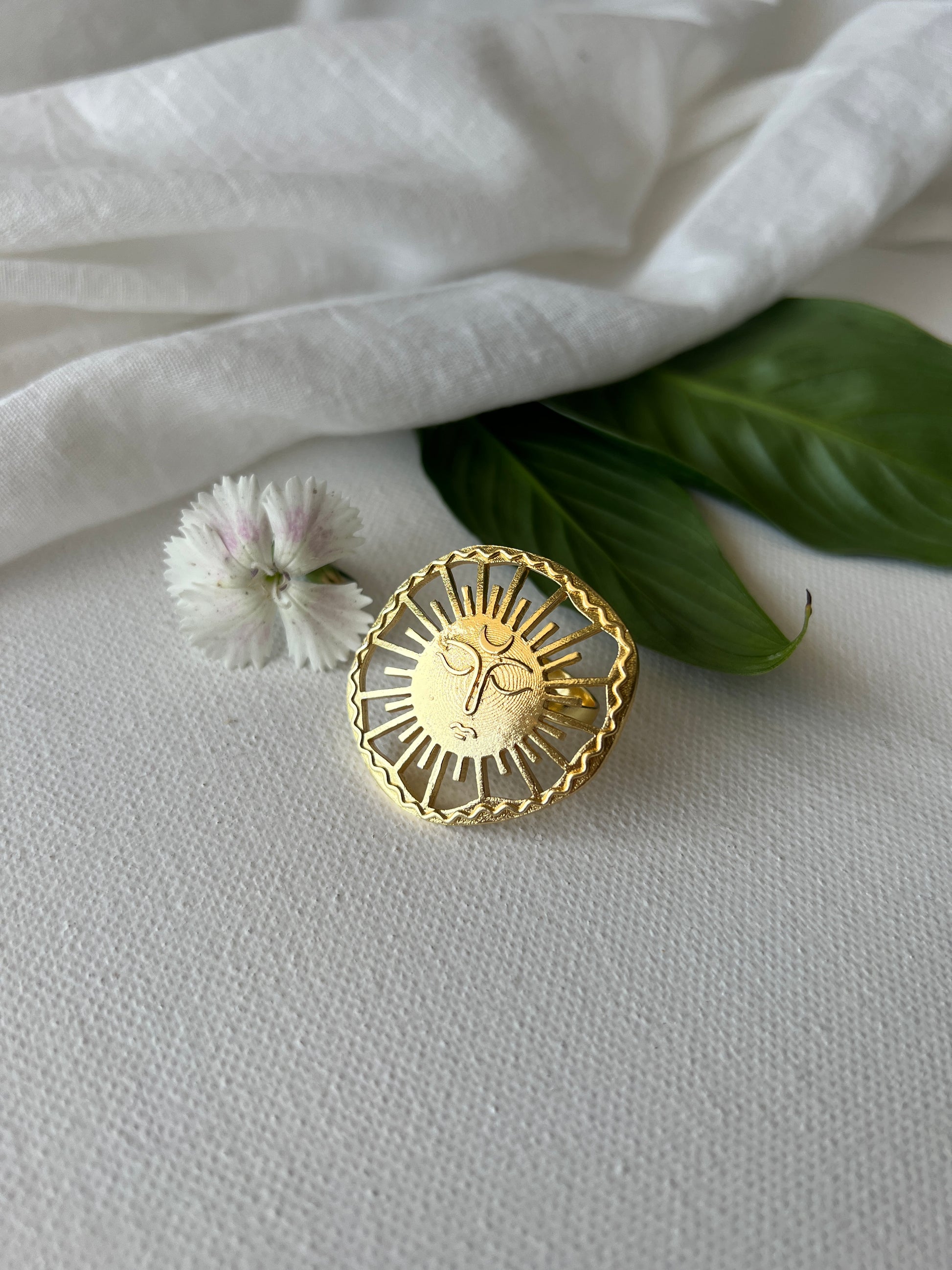 Embrace the radiant power of the "Sun Majesty Ring," a stunning handcrafted adjustable ring inspired by the divine energy of the sun. Featuring an intricate sun god motif, this ring is a celebration of strength, vitality, and celestial beauty. Meticulously crafted in brass and plated with 18k gold, the "Sun Majesty Ring" shimmers with a warm, golden glow that captures the essence of the sun’s life-giving force. This ring is more than just an accessory- it is a statement of timeless elegance and divine inspiration, perfect for those who seek to embody the brilliance of the sun in their personal style.